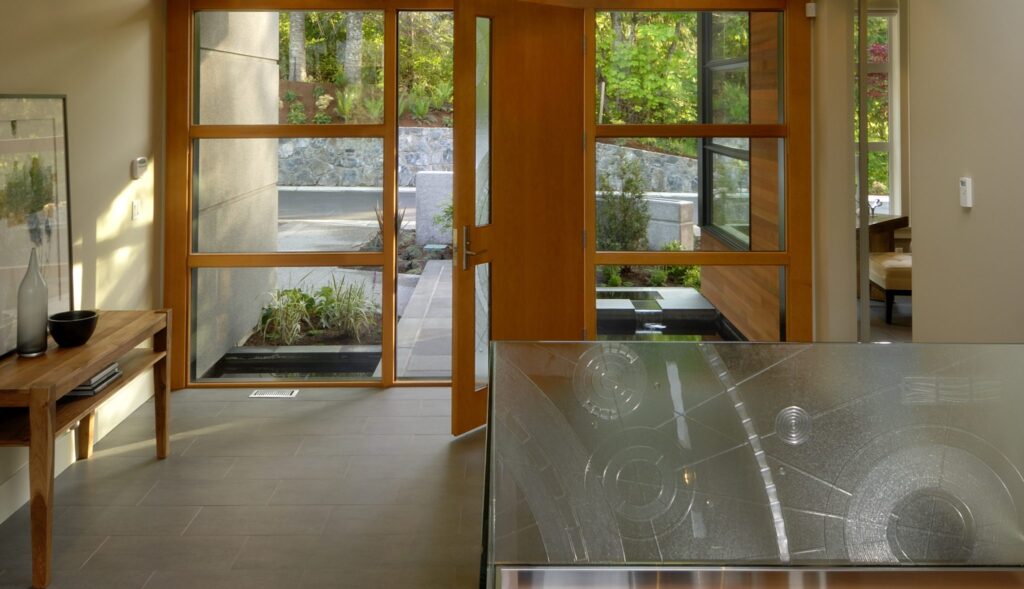 The stunning sandblasted glass handrail/guardrail at the stairs was designed by the incredibly talented Charles Gabriel of Gabriel Blasted Glass. The custom piece provides a central spectacle that ties the beauty of Victoria’s natural environment into the Japanese/West Coast Modern home. Visit https://charlesgabriel.com/anya-domine/ to learn more about Gabriel’s work on Anya Lane.